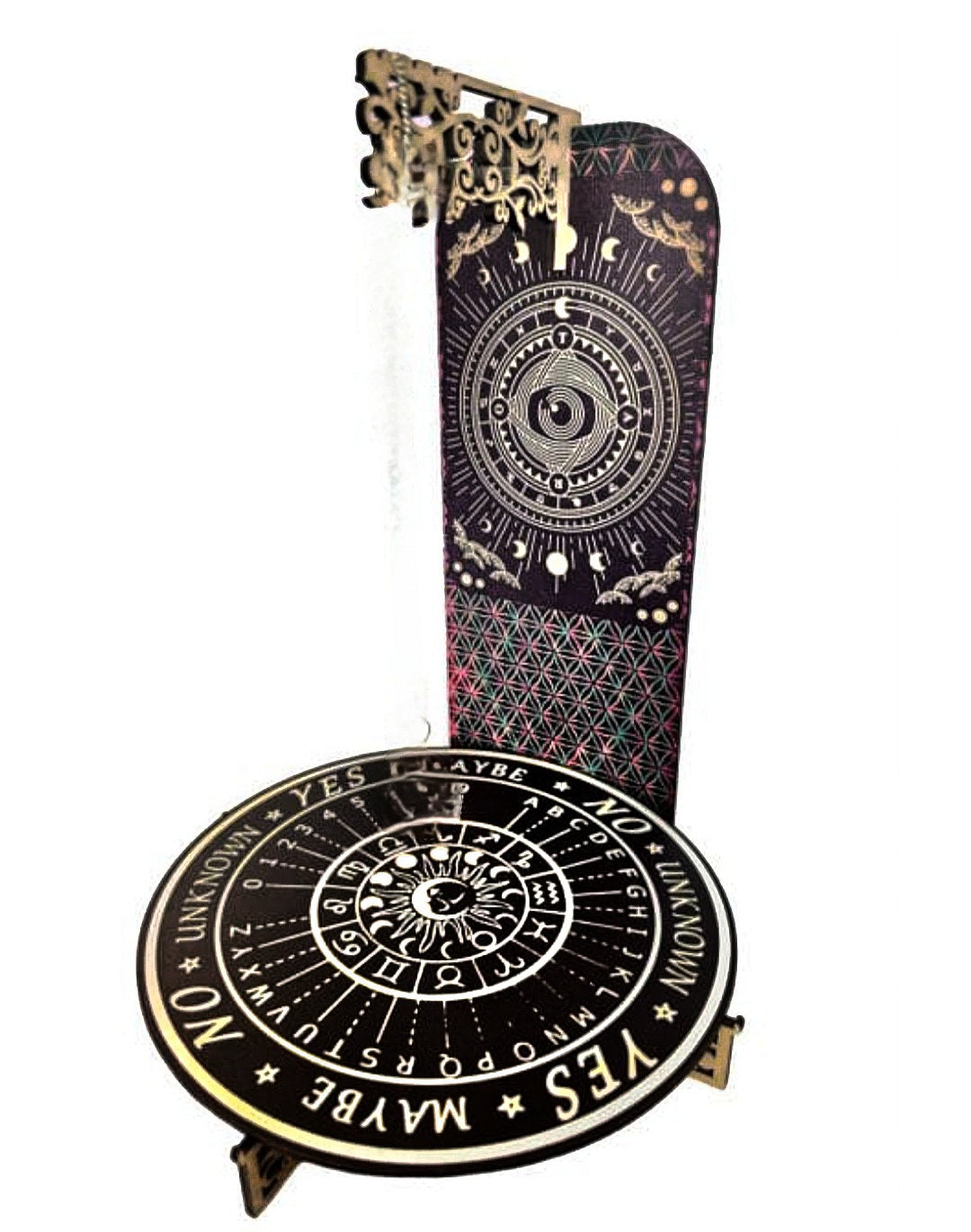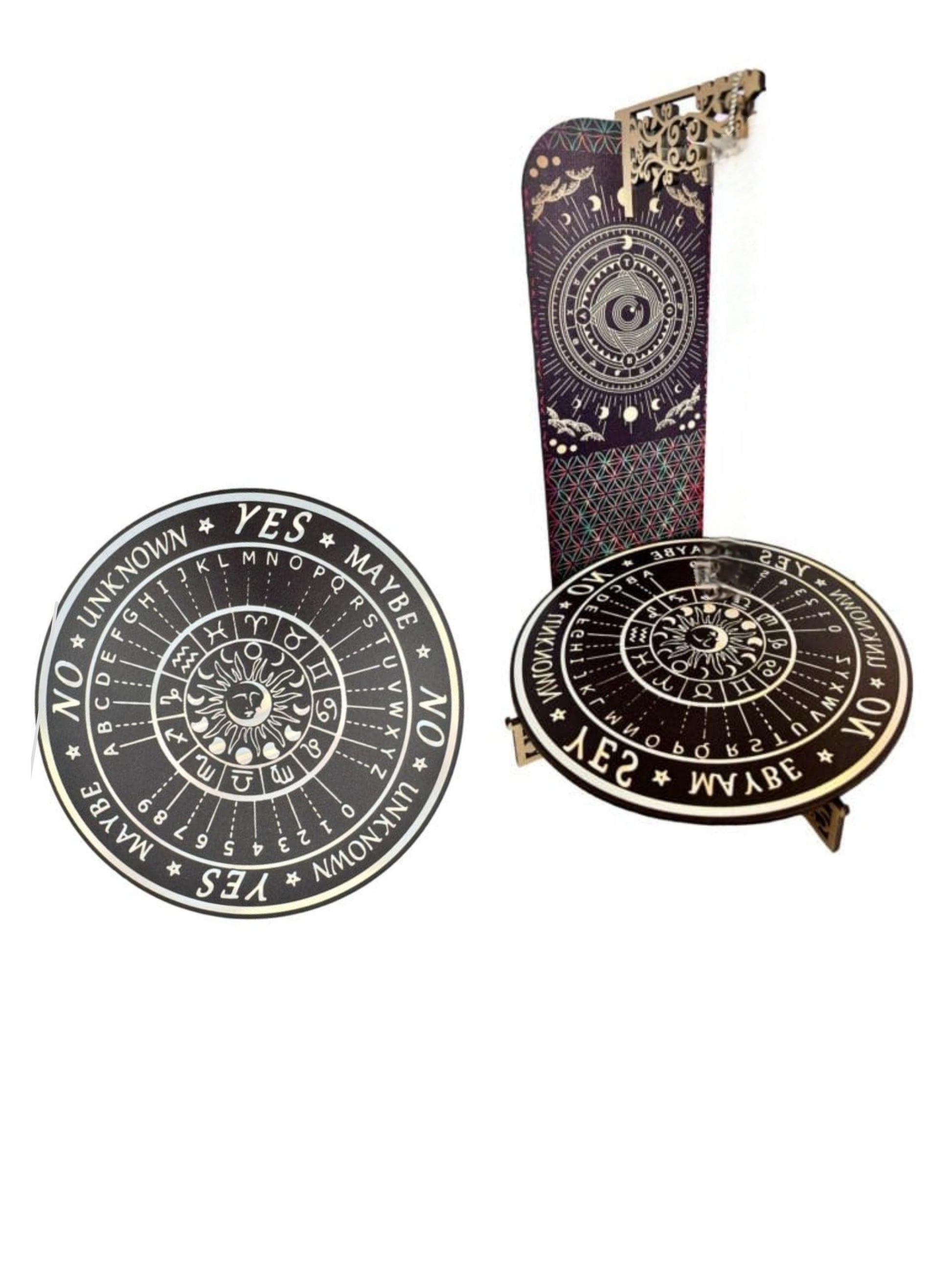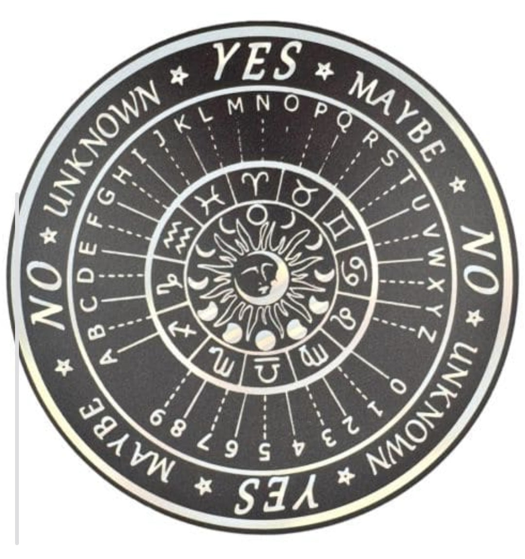Weissagungstafel Wahrsagebrett für Pendel. Mit dem Pendel können Sie Ihre Antwort ablesen. Tippen Sie das Pendel an und schauen Sie in welche Richtung es schwingt. Durch die Beschriftung auf dem Pendelkreis lassen sich die Antworten ganz leicht ablesen. Die Pendelteile werden ineinander gesteckt.